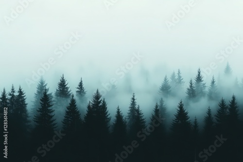 Misty Forest at Dawn: Dark Green Pine Trees Silhouetted Against a Pale Teal Sky