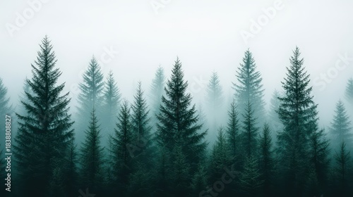 Misty Forest Landscape with Tall Evergreen Trees Shrouded in Fog and Mystique
