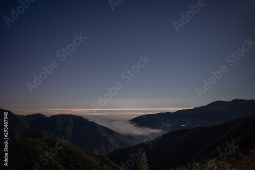 Misty marine layer creeping over Los Angeles mountains at midnight