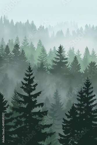 Misty Montana Forest Landscape in Pacific Northwest, Vector Style Animation