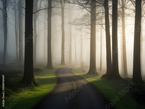 Misty morning walk through a serene forest path illuminated by gentle sunlight in early autumn