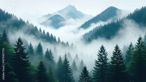 Misty Mountain Forest Landscape with Dark Green Trees