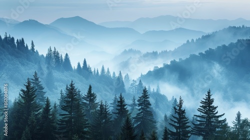 Misty mountain landscape with a valley and a forest of pine trees.