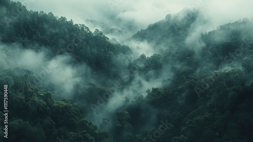 Misty Mountain Landscape with Lush Green Forests and Dense Fog Blanketing the Valleys in a Serene and Tranquil Atmosphere