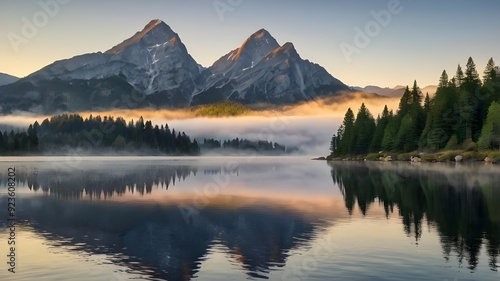 Misty Mountain Range at Dawn: Fog-Covered Peaks and Serene Reflections