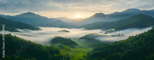 Misty Mountain Valley Sunrise Lush Green Hills and Golden Light