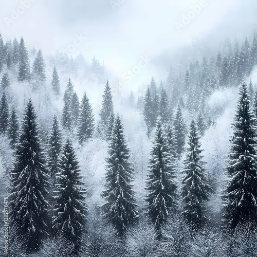 Misty Snowfall Blankets a Serene Winter Forest Landscape with Majestic Pine Trees Quietly Standing Tall.
