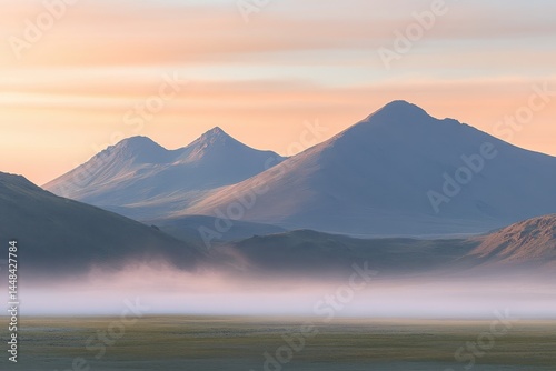 Misty sunrise over volcanic peaks. A tranquil landscape of misty mountains. Soft light paints the peaks, while a light mist hangs low over the valleys