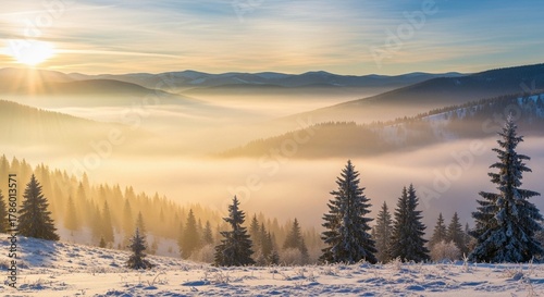 Misty valley sunrise over winter landscape with glowing sunlight, frozen trees, and serene atmospheric beauty embracing quiet dawn wilderness