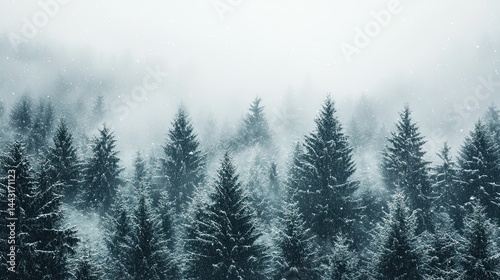 Misty winter forest scene with dark evergreens and soft snowfall. --