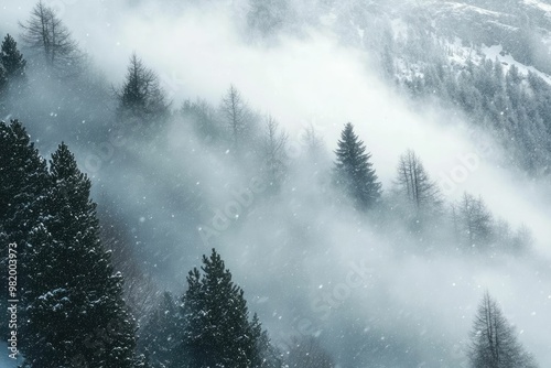 Misty winter landscape with snow-covered trees.