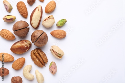 Mix of different nuts on white background, flat lay. Space for text