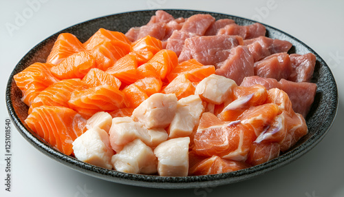 Mix of raw meat and fish. Salmon, beef, pork, chicken. Photo above
