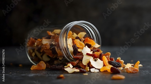 Mixed dried fruits like apple apricot and raisin spilling from a clear glass jar on a dark surface