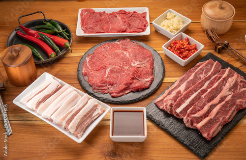 Mixed fresh Beef and pork belly set for BBQ grilling with Kimchi, fresh vegetables, fresh chili and dipping sauce, Korean BBQ.