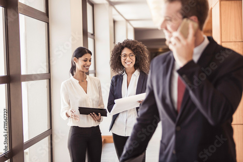 Mixed race colleagues working and brainstorming together while walking down a corridor in the office.