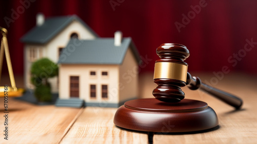 Młotek symbolizujący prawo z makietą domku, zarządzanie nieruchomościami