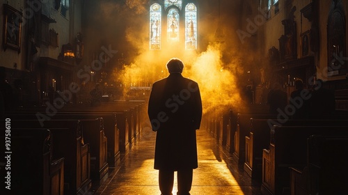 Mman standing in church looking at stained glass window
