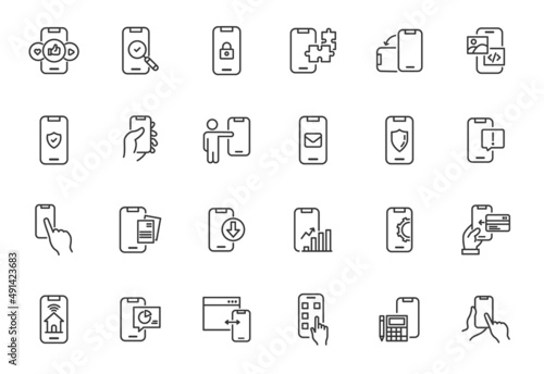 Mobile app hand hold phone line icon. Vector thin smart phone device digital application set design screen template