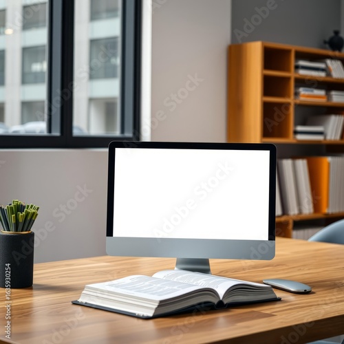 Mock up of generic design computer screen on the table workspac book mockup blank template professional presentation blank empty creative composition versatile use profess