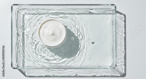 Mockup of a jar of white cream floating in clear water in a glass tray, isolated on white background for commercial usage