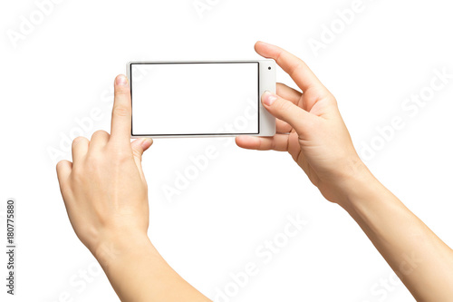 Mockup of female hands holding frameless cellphone with blank screen and making selfie at isolated background.