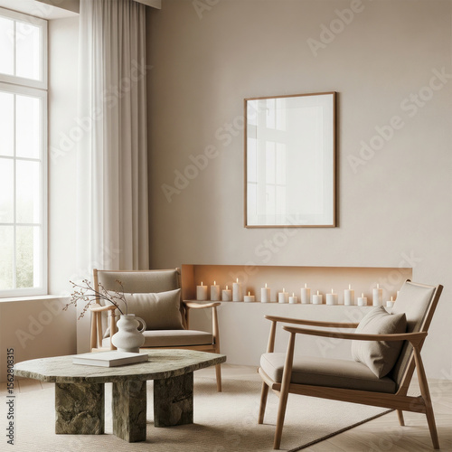 Mockup poster frame in elegant minimal living room with stone coffee table, wooden chairs, and warm candlelight ambiance