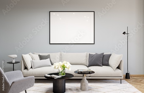 Mockup poster frame in modern interior background, living room, 3D render, 3D illustration
