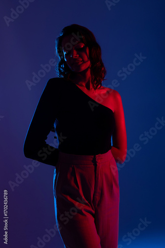 Model posing against colorful lighting in a studio setting during a photography session