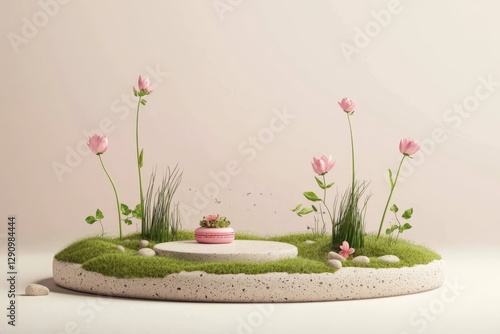 Modern aesthetic combining grass and floral illustrations with display stands.