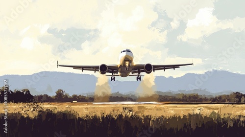 Modern aircraft taking off over a rural landscape, showcasing a dramatic scene of flight with beautiful clouds and mountains in the background, perfect for travel themes