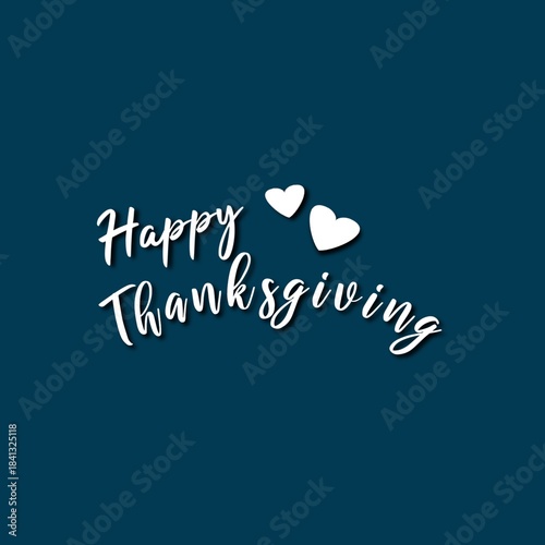 Modern and elegant graphic design with handwritten white text "Happy Thanksgiving" and two hearts on a dark turquoise background.
