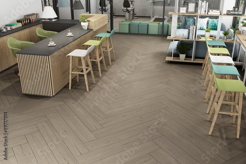 Modern and stylish restaurant interior with glamour wooden table, elegant chairs and design decoration. Template. Gray and white background wall. Minimalistic concept of interior design. 3D Rendering
