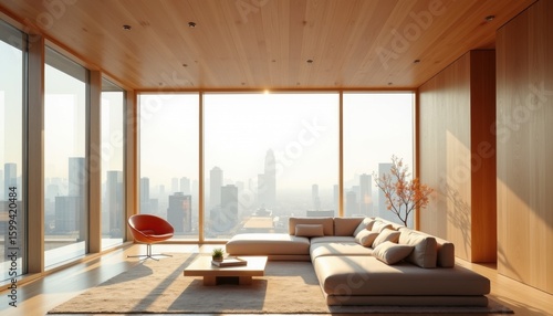 Modern Apartment Living Room with City Skyline View and L-Shaped Sofa