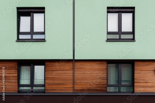 Modern architecture showcases a green building with wooden accents and large windows, highlighting contemporary design elements and urban aesthetics