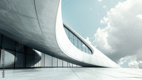 Modern architecture with curved lines and reflective glass under cloudy sky