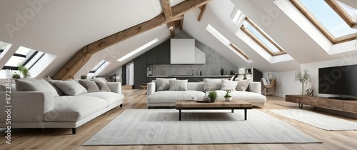 Modern attic living room with skylights, exposed wood beams, minimalist decor, white sofas, and an open plan kitchenette Ideal for bright, stylish home interiors