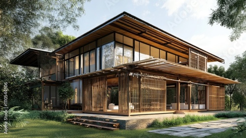 Modern bamboo house nestled in lush greenery.