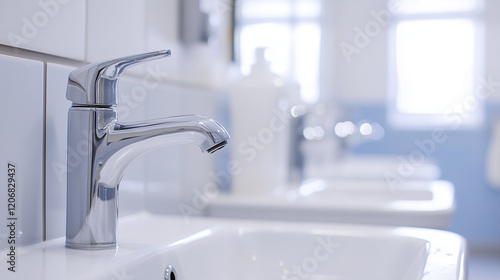 Modern Bathroom Faucet Detail: Close-up view of a sleek, chrome faucet in a modern bathroom setting, emphasizing the clean lines and minimalist design.