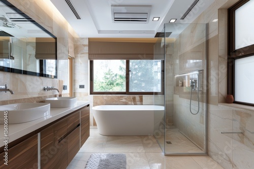 Modern bathroom interior design featuring a freestanding tub and glass shower enclosure with natural light
