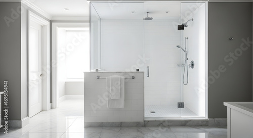 Modern bathroom interior with a luxurious walk-in shower and elegant design