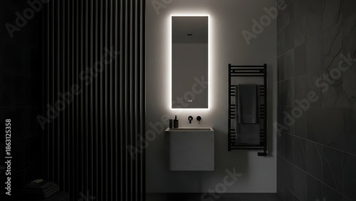 Modern Bathroom Vanity with Illuminated Mirror and Towel Warmer.