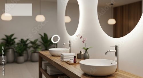 Modern bathroom with two round mirrors, wooden vanity, and white sinks.