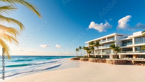Modern Beachfront Hotel with Palm Trees and White Sandy Beaches