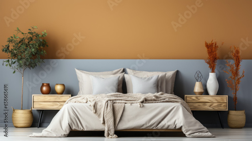 Modern bedroom interior design with pastel orange and grey wall and two bedside tables. 3D render.