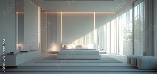 Modern bedroom interior with natural light and minimalistic design.