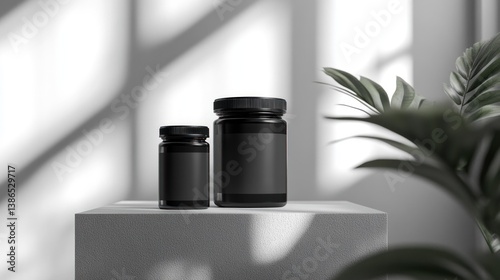 Modern black jars on a podium, minimalist interior with plants, product presentation