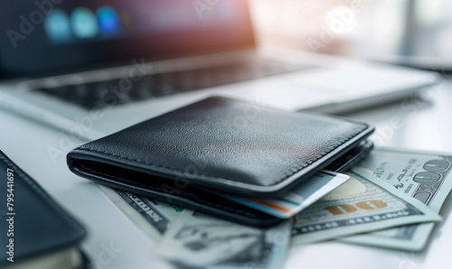 Modern Black Leather Wallet with American Dollar Bills on Wooden Table