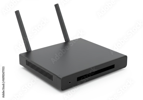 Modern, black network device with antenna elements, presented in a setting against a plain white background.