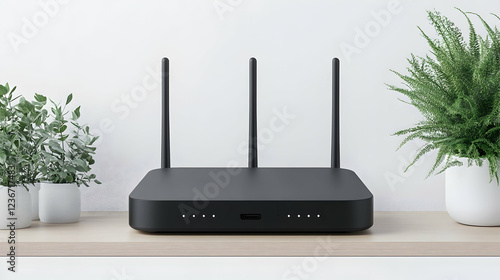 Modern black wifi router on shelf, plants in background, home internet